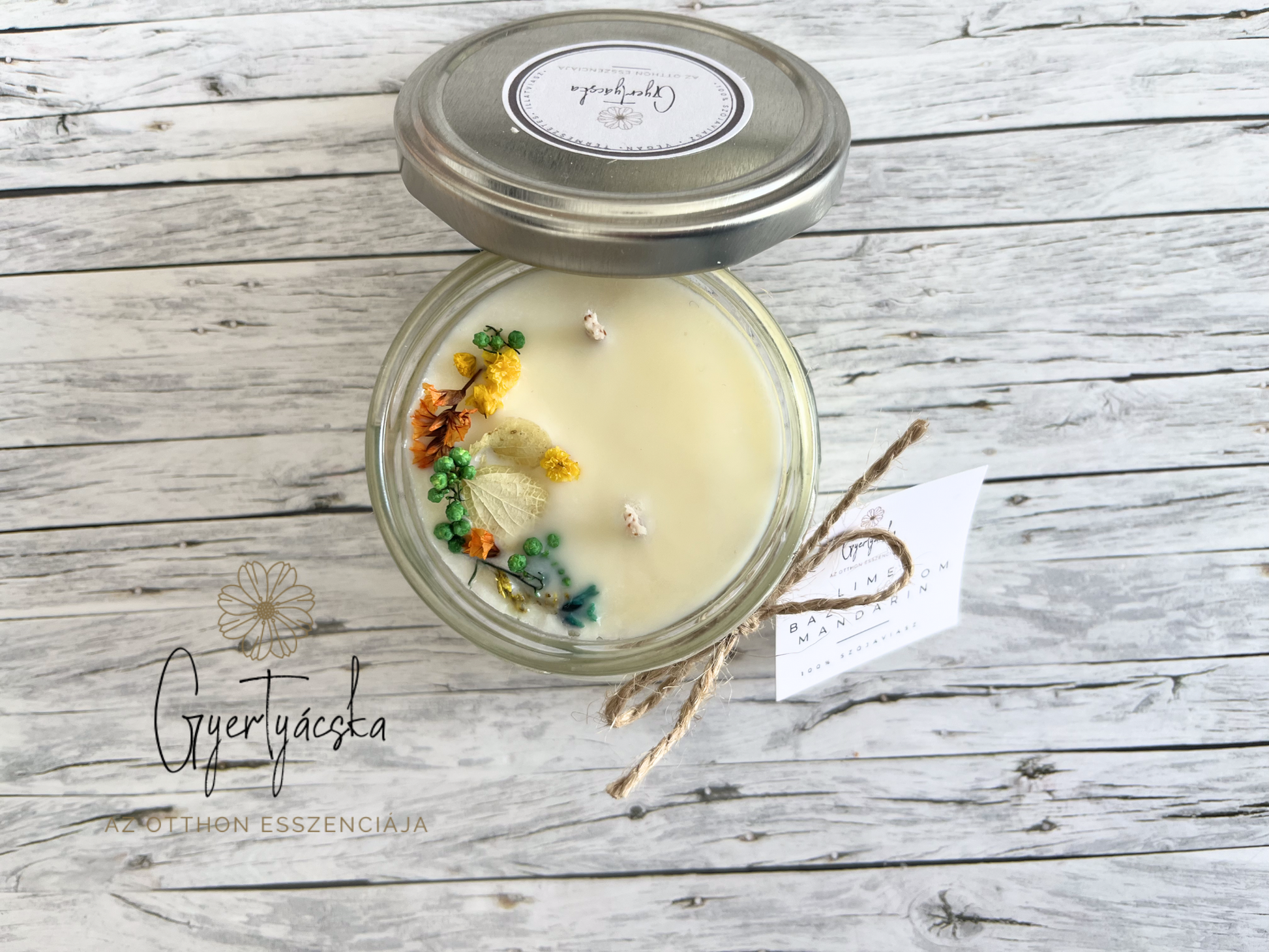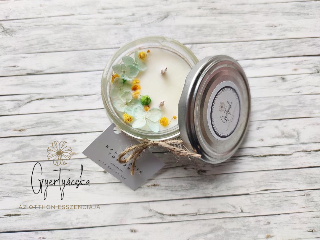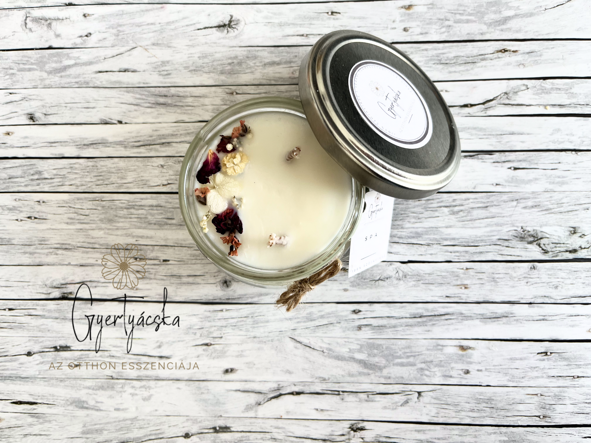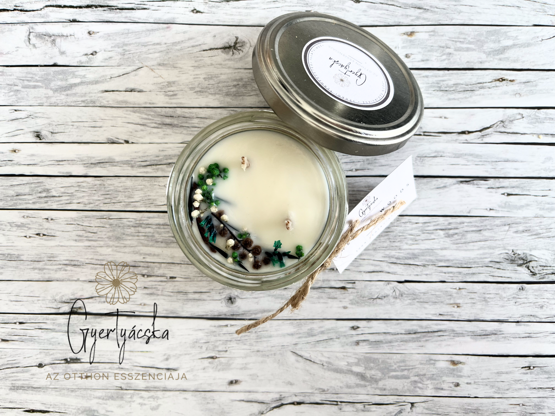 A dekoratív kis csupor 7,2 cm átmérőjű, és 100 g szójaviaszt, szárított virágokat zár magába a legfinomabb illatokkal. Prémium illatanyag, és dupla pamutkanóc felhasználásával. Vegán, állatkísérletektől mentes termék. Égési idő: 20-25 óra.