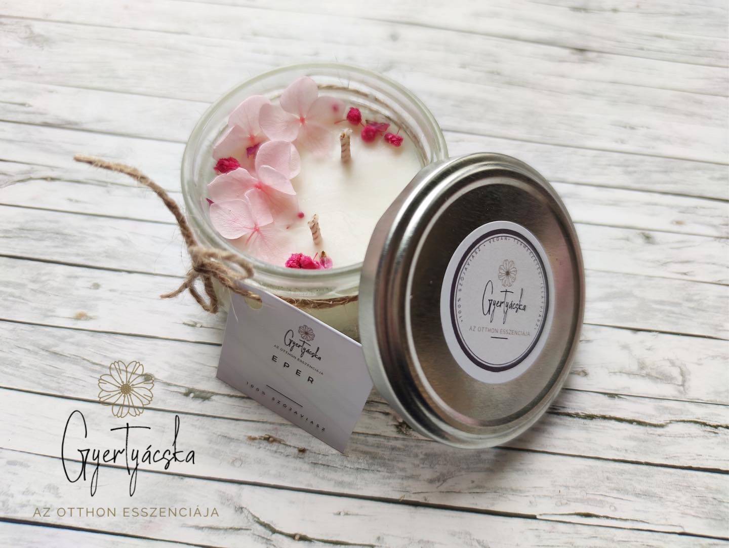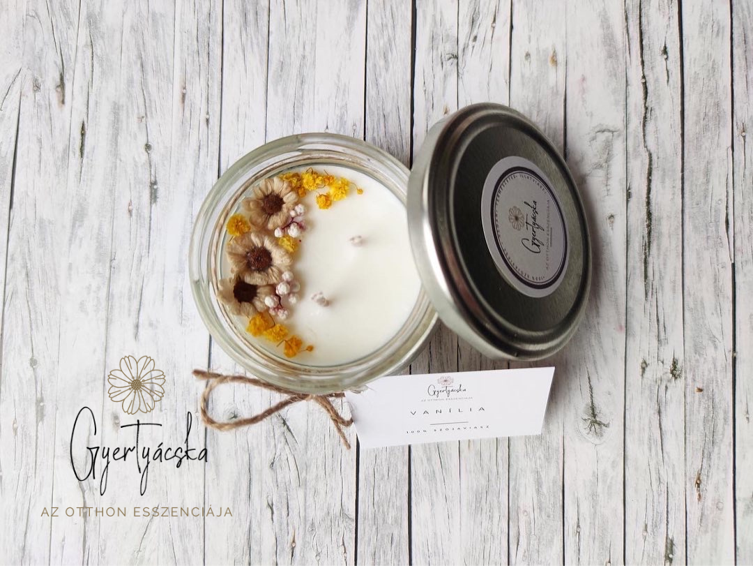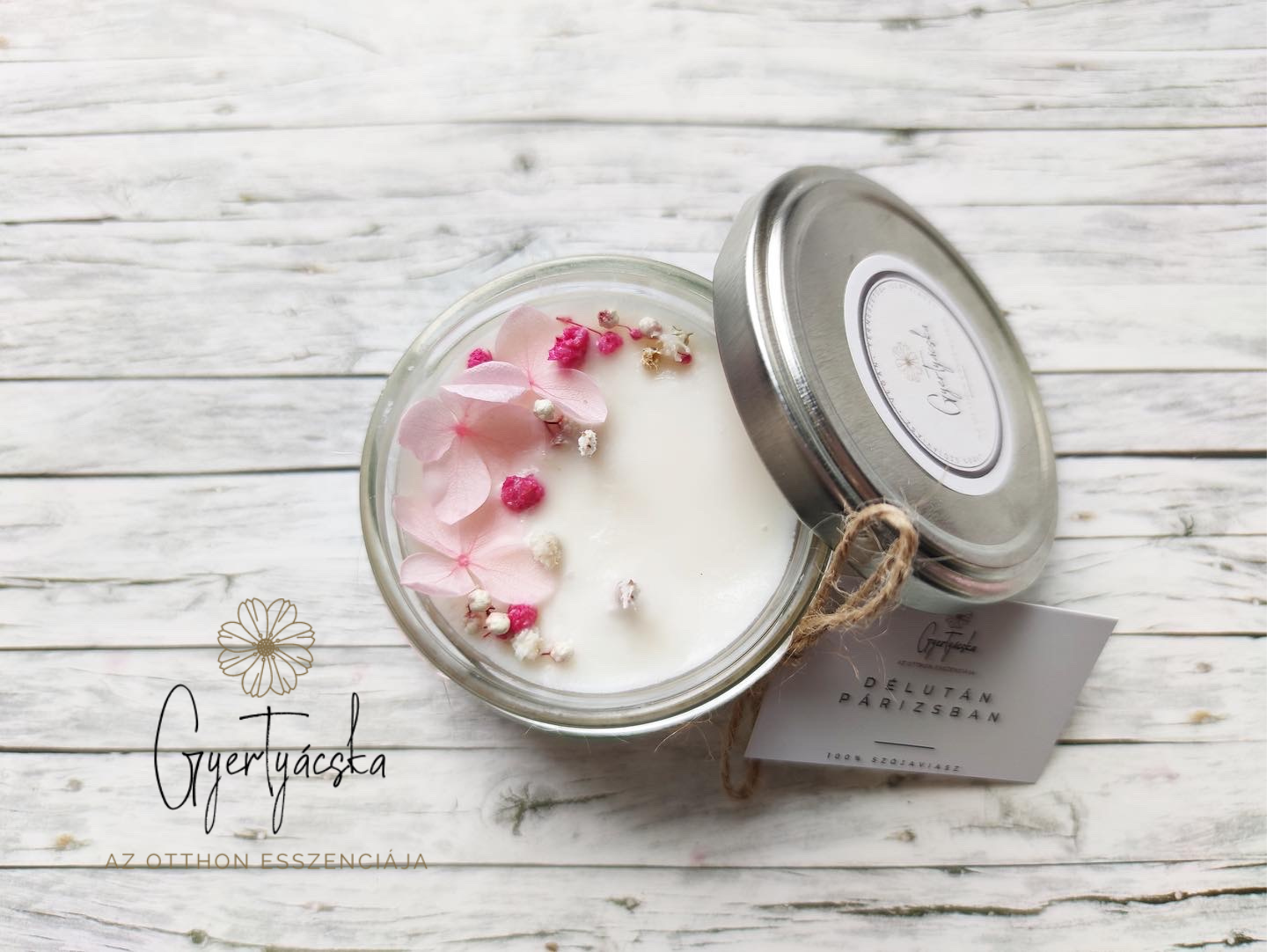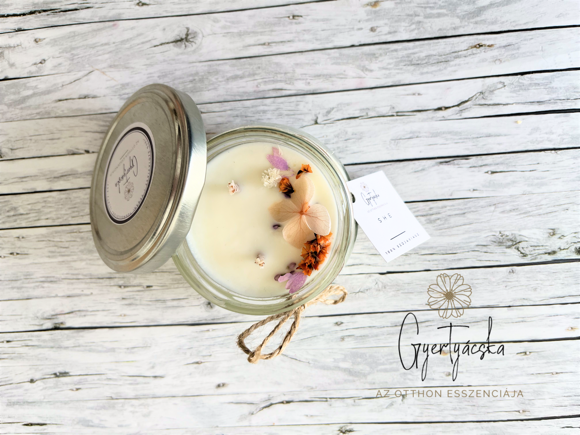 A dekoratív kis csupor 7,2 cm átmérőjű, és 100 g szójaviaszt, szárított virágokat zár magába a legfinomabb illatokkal. Prémium illatanyag, és dupla pamutkanóc felhasználásával. Vegán, állatkísérletektől mentes termék. Égési idő: 20-25 óra.