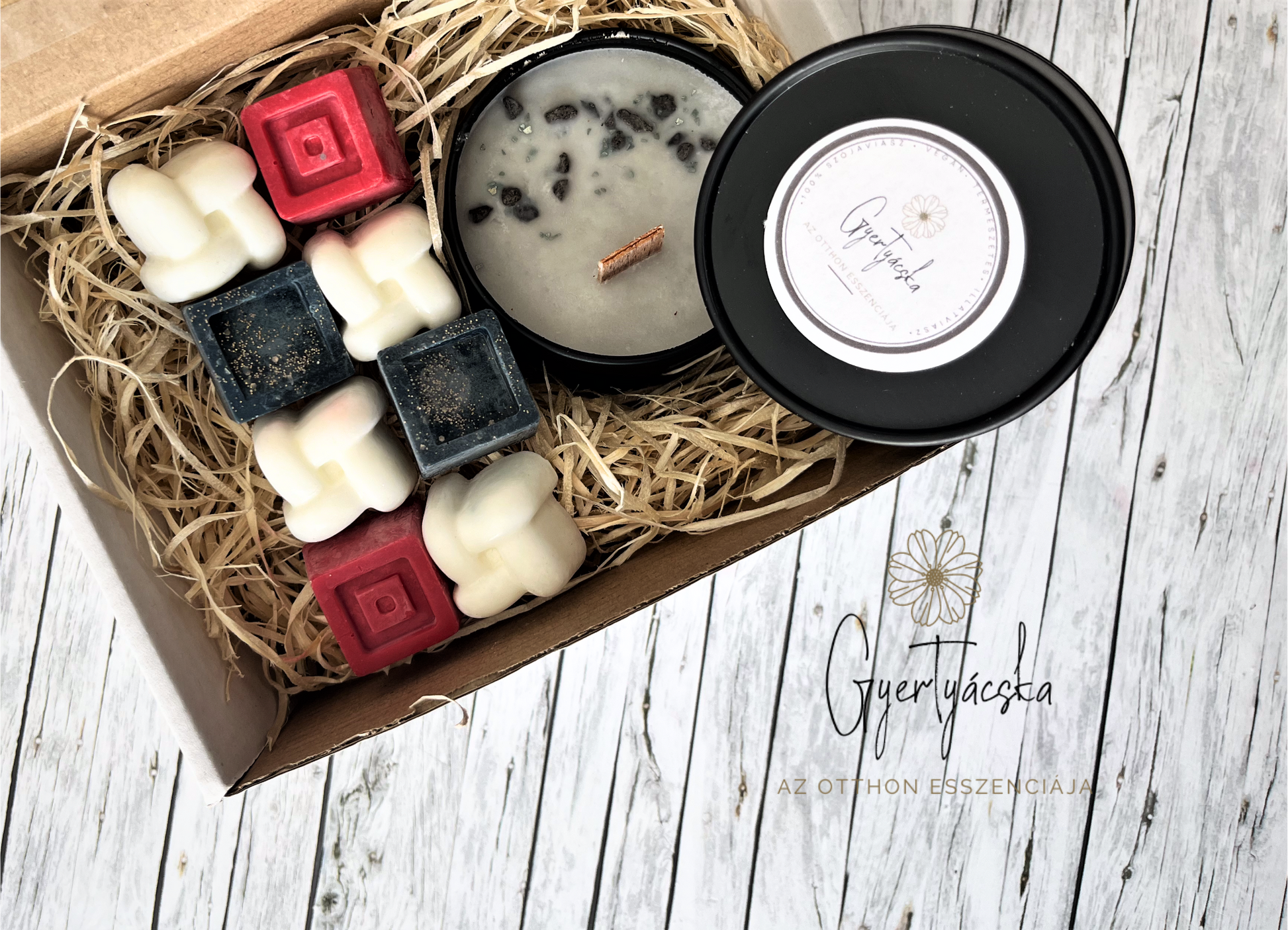 Parfümös férfi illatválogatás, amely tartalmaz 8 db 5 g-os illatviasz bonbont, és egy fém tégelyes, 80 g-os, fa kanócos illatgyertyát.Vegán, állatkísérletektől mentes termék.