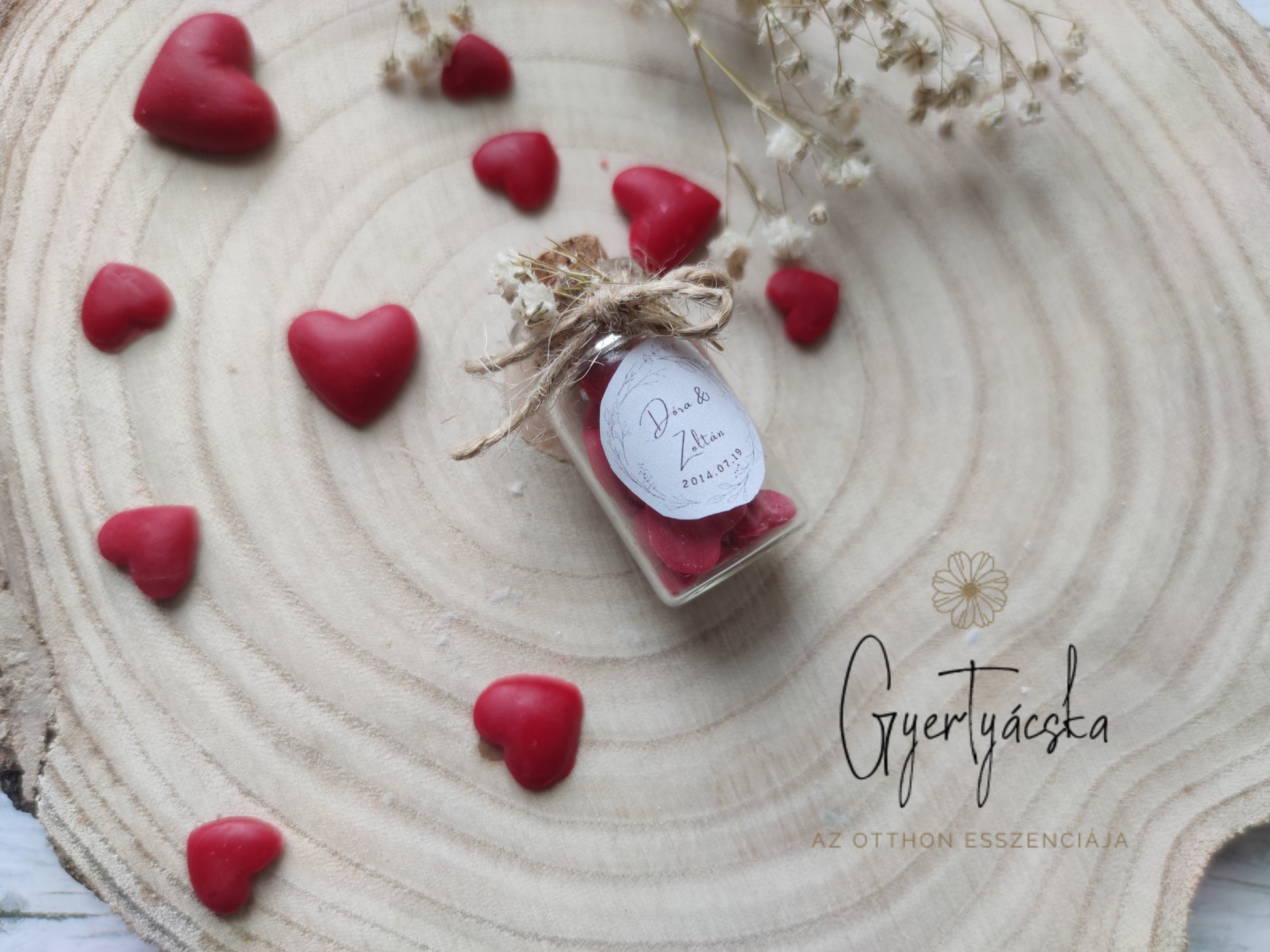 Apró illatviasz szívecskék üvegbe zárva. Szín és illat választható. Az üvegcse 100% szójaviasz, állatkísérletektől mentes, vegán, prémium anyagok felhasználásával készült illatviaszt tartalmaz. Az ár 50 db-ig érvényes, 50 db feletti rendelés esetén kérj egyedi árajánlatot. A megálmodott szín, illatot, és dekorácót írd le megjegyzésbe, vagy vedd fel velünk a kapcsolatot.