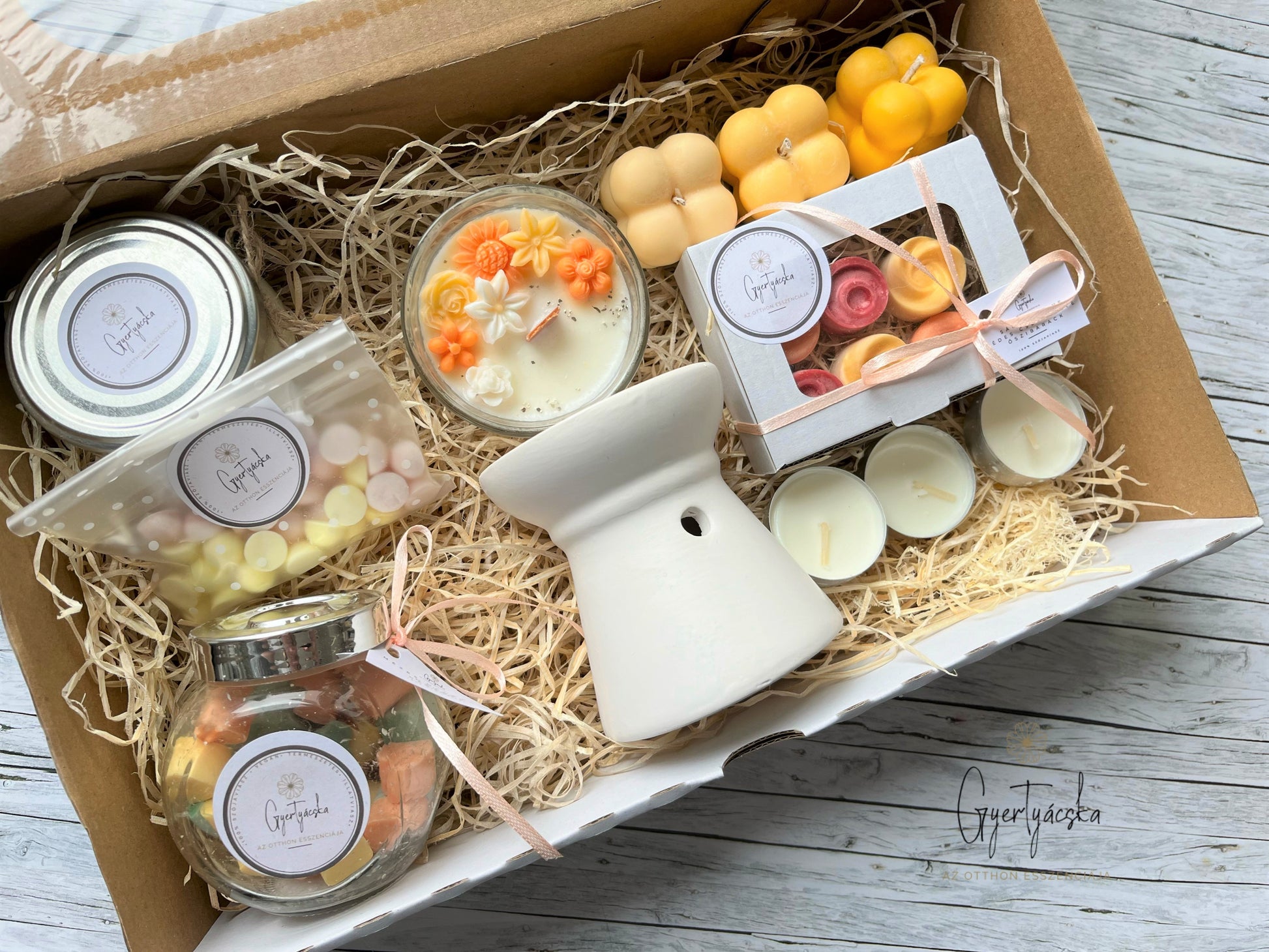 Különleges ajándék szeretteid, barátaid számára. Az igényes csomagolás magába zár egy kerámia viaszolvasztót, hozzá tartozó 3 mécsessel, 3 db buborék gyertyát lime- bazsalikom- citrom, Bergamonttt és sárgadinnye Illatban, egy dupla pamutkanócos Napsütötte Toszkána illatgyertyát, egy csomag illatviaszt citromos süti illattal, és egy csavaros üvegbe zárt mézes mandarin, mangó, narancs illatvariációt, egy doboz sárgadinnye, édescseresznye, őszibarack bonbonválogatást, és egy fa kanócos őszibarackos illatgyertyát. Sárga árnyalatú színösszeállítás