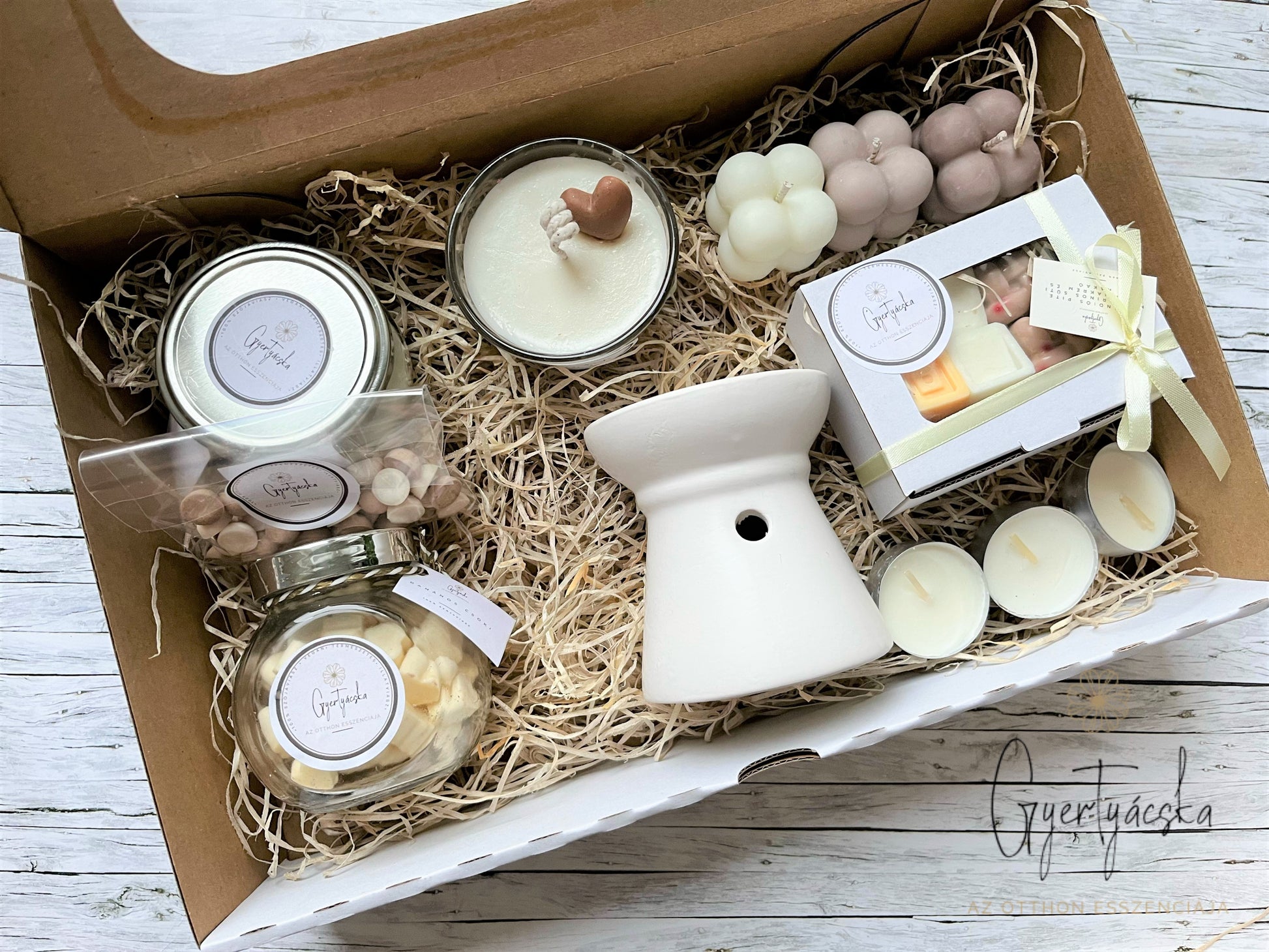 Különleges ajándék szeretteid, barátaid számára. Az igényes csomagolás magába zár egy kerámia viaszolvasztót, hozzá tartozó 3 mécsessel, 3 db buborék gyertyát vaníliás macaron, sós karamell, diós-mézes puszedli illattal, egy dupla pamutkanócos pekándiós pite illatgyertyát, egy csomag illatviaszt kávé vaníliával ilattal, egy csavaros üvegbe zárt banános csoki illatviasz, pekándiós pite, mandarinos süti, vanília kakaókrém illatvariációjú bonbonokat és egy pamut kanócos gyertya vanília, csoki és bourbon karamell .