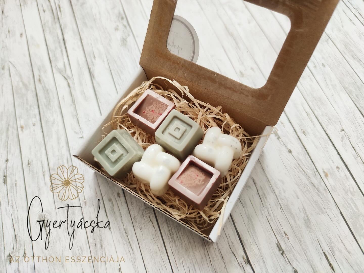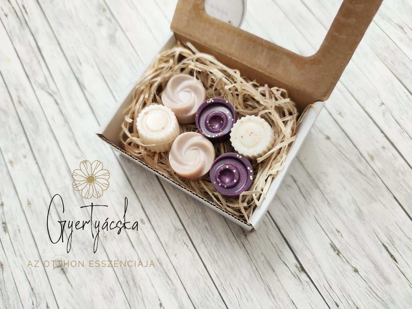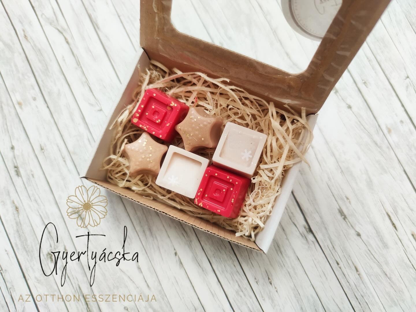 A doboz tartalma 3 varázslatosan intenzív téli illat kombinációja, 6 db 5 g-os 100% szójaviasz bonbon prémium illatanyag felhasználásával. Vegán, állatkísérletektől mentes termék.